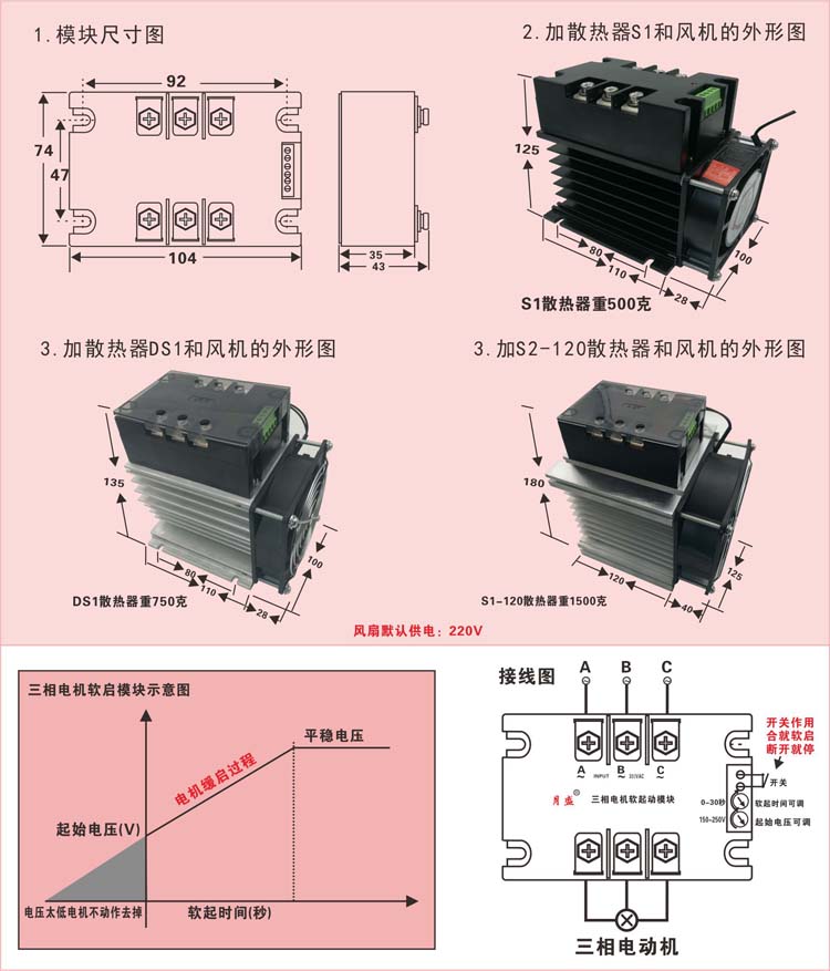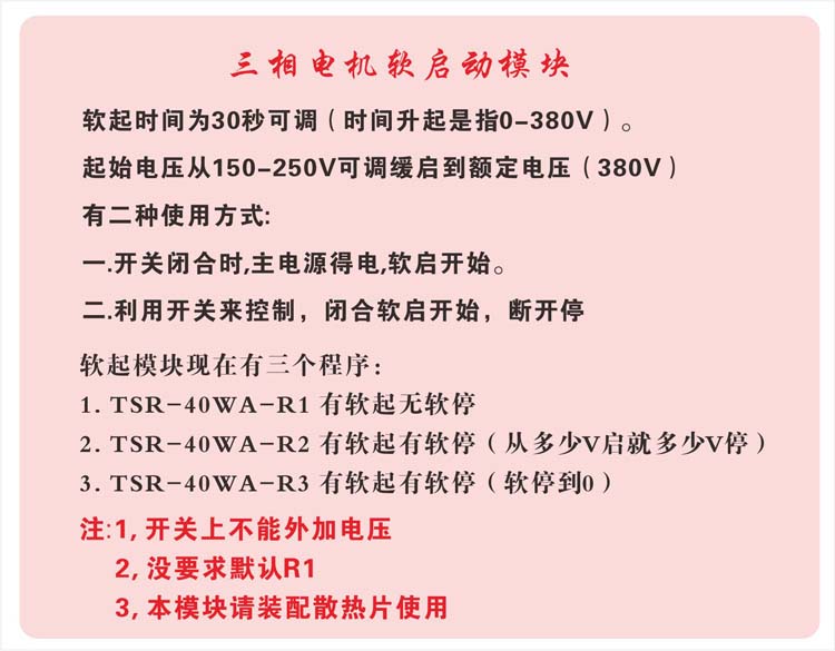 一. 三相電機軟起動模塊特點,全新產(chǎn)品,詳情請來電13636400688 ① 不用信號,可直接軟起,軟起時間(0-30秒)可預(yù)設(shè).起始電壓(150-250V)可預(yù)設(shè) ?、?可控硅輸出,可用于三相星形三角形接法 ③ 使用時需配適當散熱器,必要時加強迫風冷. ?、?本產(chǎn)品是將晶閘管主電路和移相觸發(fā)控制電路封裝在一起的多功能功率集成模塊 ?、?阻燃工程塑料外殼,銅底板,高溫焊接,瞬間承受過載能力強 ?、?主要用途風機調(diào)速,力矩電機調(diào)速,普通電機軟起動等 二. 三相電機軟起動模塊產(chǎn)品概述 用途:水泵,風機,航車,自耦變壓器等及三相電機軟啟動,替代可調(diào)自耦變壓器,變頻器軟啟動等,接線簡單, 不用接旁路接觸器,經(jīng)濟實用,填補同類產(chǎn)品空白。